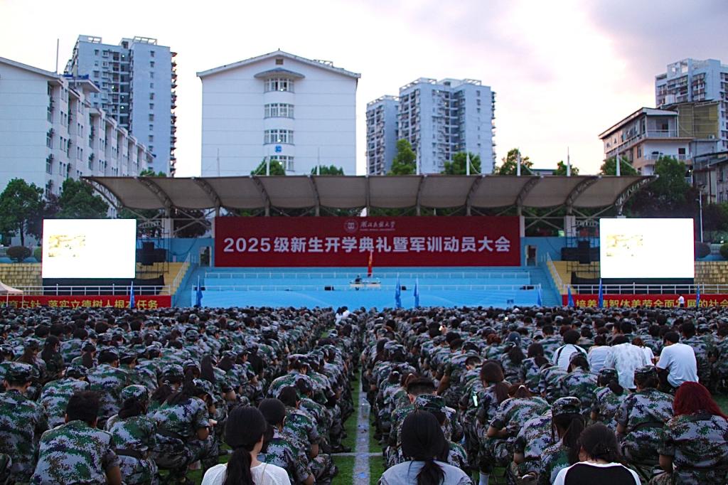 9月6日,湖北民族大学保卫工作部特邀恩施军分区大校副司令员蔡立波、恩施州消防救援支队副支队长范海云在五环体育场为全体2025级近6000名新生举行了一场意义深刻的国防教育与消防安全专题教育讲座。本次活动由湖北民族大学保卫工作部部长周代明主持。
