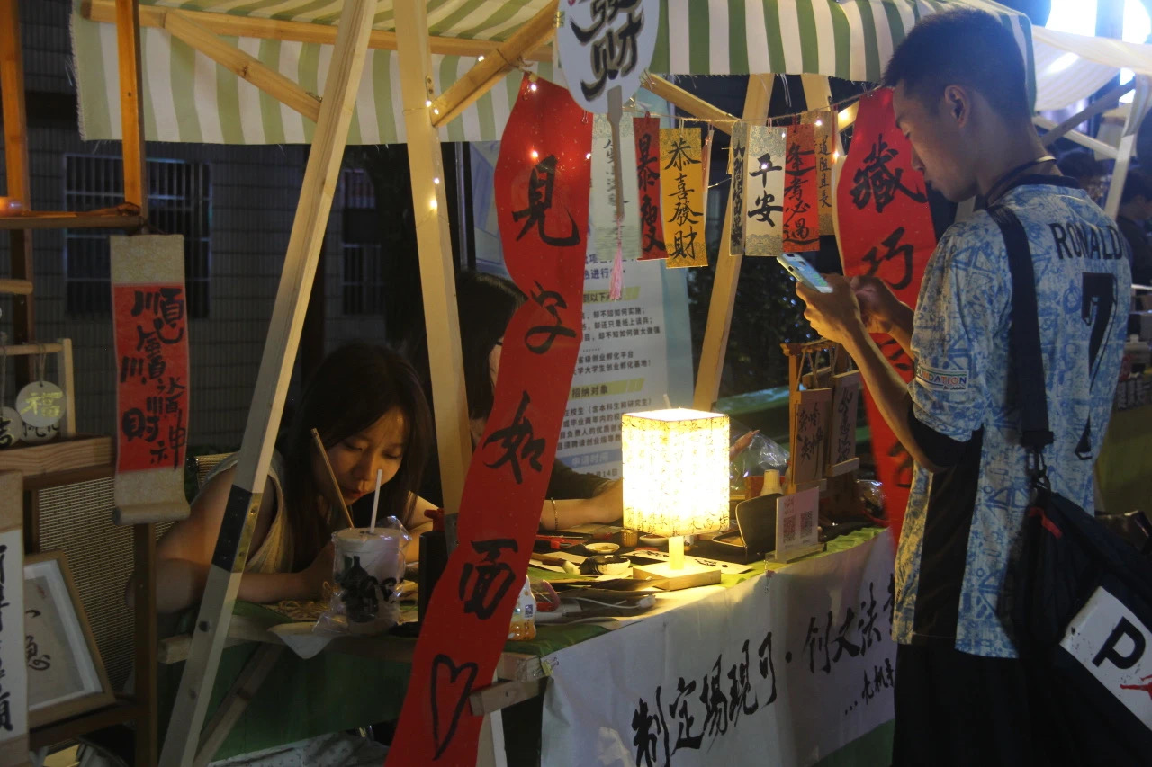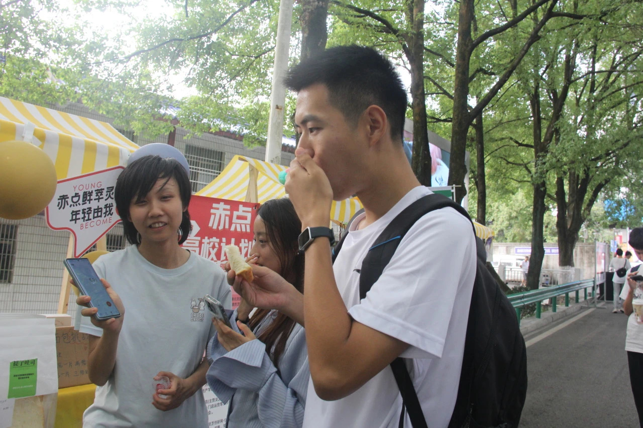 本次创客集市的项目团队成员均为民大在校大学生,项目涵盖书法艺术、非遗文创、中医推拿、特色美食等多种类别。在活动现场,美食的香气扑鼻而来,令人垂涎欲滴;艺术创作的摊位前,一幅幅作品色彩斑斓;“一分钟吃完一片面包”小游戏,挑战者们纷纷拼尽全力。