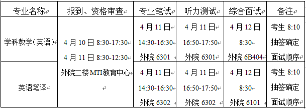 报考“英语笔译”的同等学力考生,需加试《应用翻译》《文学翻译》两门课程;报考“学科教学(英语)”的同等学力考生,需加试《语言学》《英语教学法》两门课程。考试时间为3小时,满分均为100分,低于60分为不合格,加试科目成绩不计入复试总成绩。