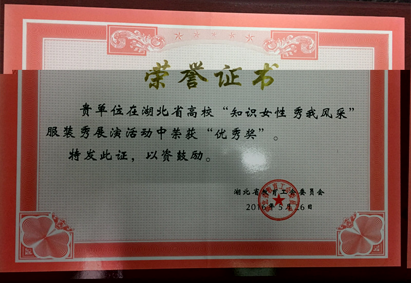 2016年5月26日,我校代表队参加湖北省高校“知识女性 秀我风采”服装秀展演荣获“优秀奖”。