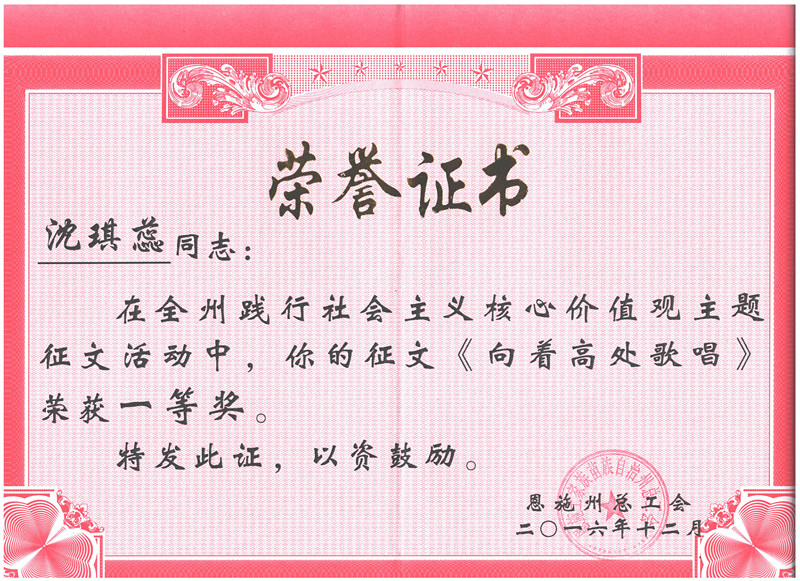 我校沈琪蕊谭胡鑫两位老师在践行社会主义核心价值观主题征文活动中获奖