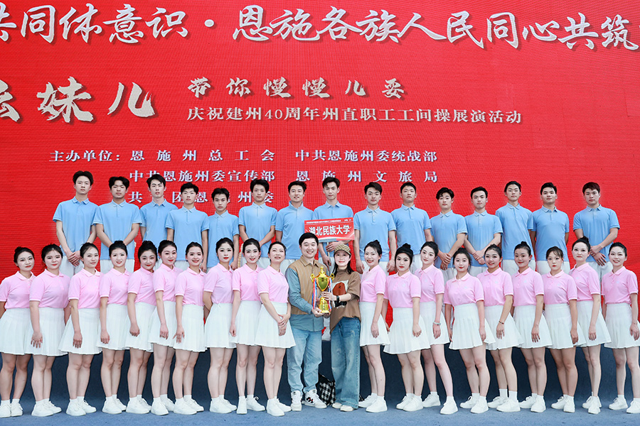 4月11日,铸牢中华民族共同体意识·恩施各族人民同心共筑中国梦——庆祝建州40周年《幺妹儿带你慢慢儿耍》州直职工工间操展演活动在恩施州工人文化宫广场成功举行,由学校工会组织的教职工代表队荣获二等奖。
