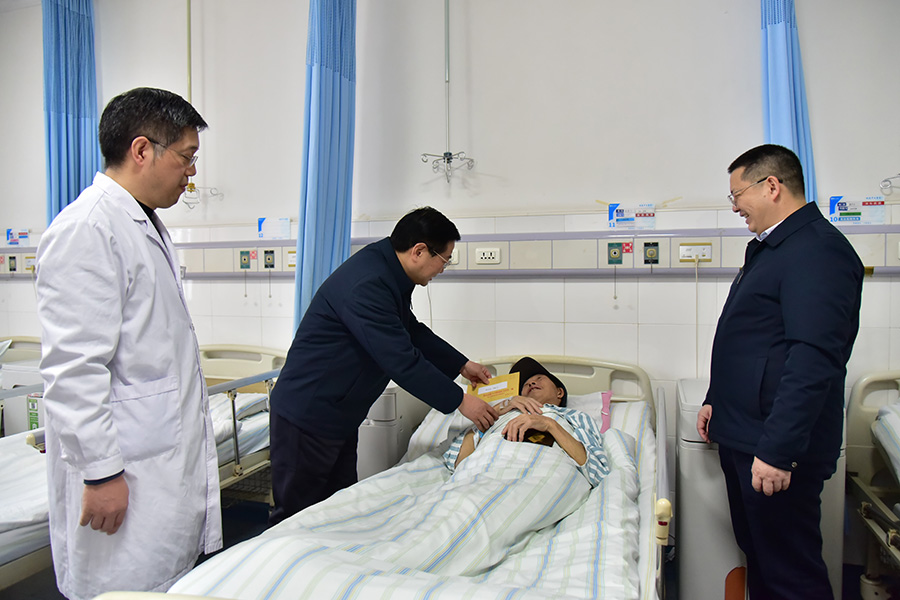 在民大医院,邓磊一行走进临床科室,看望慰问坚守在岗位一线的医护人员及住院患者,为他们送上慰问品,并向他们及家属致以诚挚的问候和美好的祝福。邓磊详细询问了医院春节期间值班值守、医疗接诊、后勤保障等情况,对医护人员舍小家、顾大家,坚守工作岗位、精心呵护患者表示感谢,强调务必确保春节期间医疗服务有序运行,让每一位住院患者都享受到安全、舒心的医疗服务。