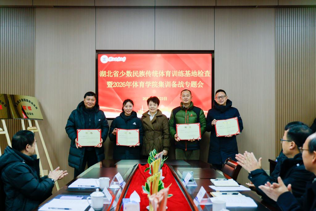 1月23日,高脚竞速、板鞋竞速、陀螺三个省级民族传统体育项目基地在湖北民族大学正式揭牌。省民宗委二级巡视员程家忠,湖北民族大学党委常委、统战部部长田景福出席湖北省少数民族传统体育训练基地检查指导暨2026年体育学院集训备战专题会,并共同为三个省级项目基地揭牌。