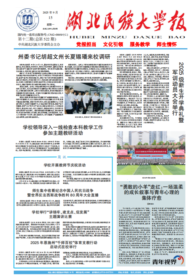 3月13日,2025年度湖北高校新闻奖评选结果揭晓,湖北民族大学25件新闻作品获奖。其中一等奖5件,二等奖7件,三等奖13件,获奖作品涵盖文字消息、文字评论、通讯与深度报道、版面和页(界)面设计、副刊、新闻摄影、新闻视频、融合创新、新闻标题等九个类别,获奖数量位居全省高校前列。