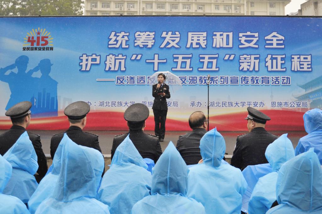 为深入贯彻落实总体国家安全观,增强师生国家安全意识,营造“国家安全、人人有责”的浓厚校园氛围,4月13日,由湖北民族大学与恩施州公安局联合主办,学校平安办与恩施市公安局共同承办的“筑牢青春防线·共护国家安全”4·15国家安全日主题宣传教育启动仪式暨反恐处突应急演练展演在学校举行。