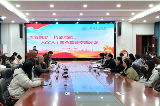本网讯(见习记者 佘思咏 彭如妍 刘晨怡 记者 苏燕康/文 记者 周颀涵 见习记者 文秀娟/摄)2025年11月21日,经济与管理学院ACCA主题分享暨交流沙龙活动在经管楼附303会议室举行。启瑞集团首席财务官万金成,ACCA市场拓展经理郭姝、ACCA市场拓展主任胡姚瑶,高顿教育教师代表张颖洁、谢晖、胡伊宁,经济与管理学院党委书记陈霞,副院长冉瑞恩,会计系副主任张尊应邀出席,ACCA方向班24级、25级学生本次活动。经济与管理学院会计学系主任刘洁玫担任主持人。