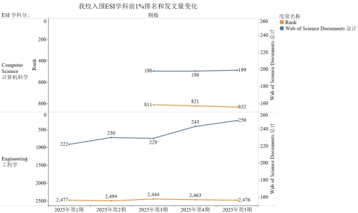根据基本科学指标数据库(Essential Science Indicators,简称ESI)2025年9月11发布的最新数据显示(2025年9月11日更新,数据涵盖10年6个月:2015年- 2025年6月),本期共有9990家研究机构进入ESI全球前百分之一,本期共有9990家研究机构进入ESI全球前百分之一,我校共有2个ESI学科进入全球前1%,如图1和图2所示分别是Engineering工程学和Computer Science计算机科学。