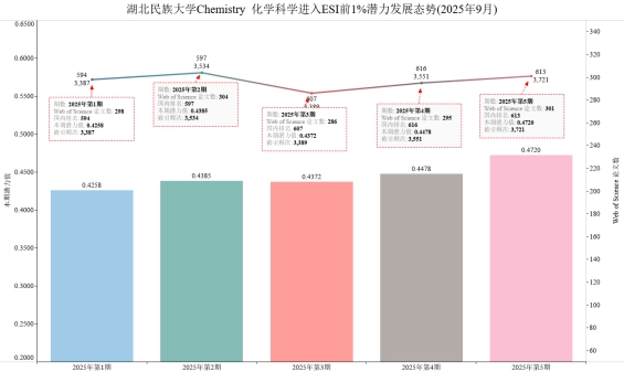 本期我校有望进入ESI前1%的学科Chemistry化学学科,潜力值为0.4720,论文数301,引用量3721,本期入围阈值7883。
