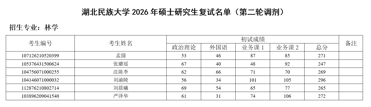 林学园艺学院2026年硕士研究生招生复试名单(第二轮调剂)