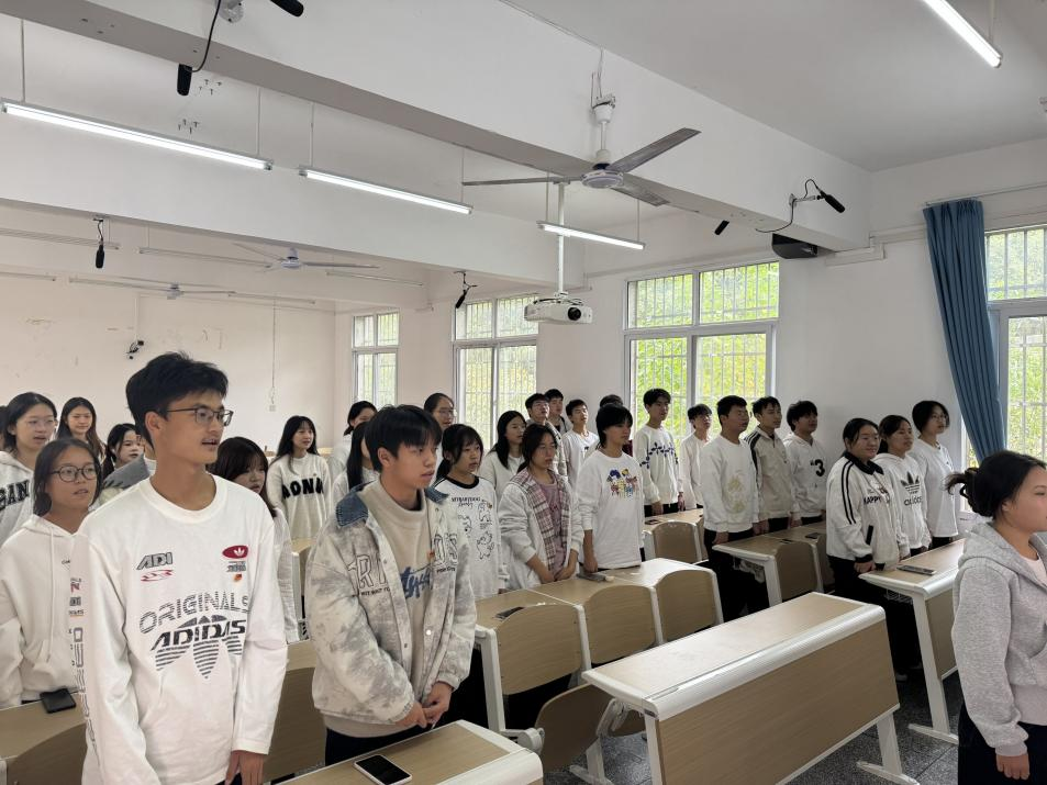 在庄重热烈的团日教育环节中,全体团员面向团旗,高举右拳,重温入团誓词。铿锵誓言回荡会场,进一步强化了团员的责任感与使命感。随后,全体成员齐声高唱《光荣啊,中国共青团》,在嘹亮歌声中增强了团员意识。“击鼓传花·猜历史杰出青年”互动环节寓教于乐,让同学们在轻松氛围中学习青年先辈的奋斗事迹,汲取前行力量。
