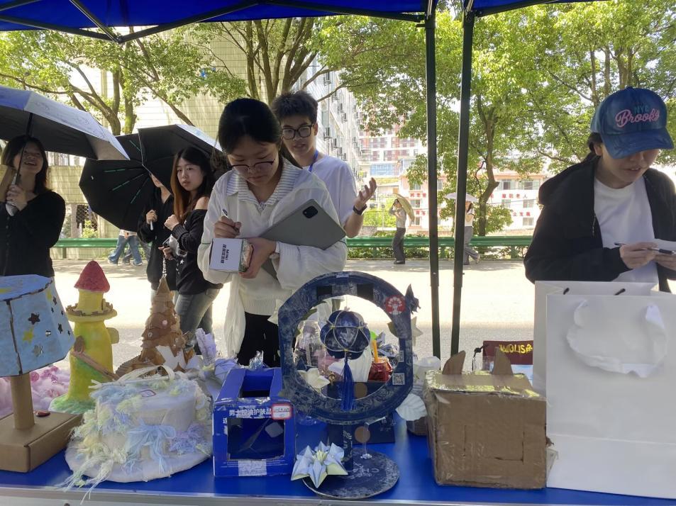 在“变废为宝”创意作品展区,参赛师生以塑料瓶、废纸箱、旧书报等生活废旧材料为原料,精心制作笔筒、收纳盒等实用文创作品。作品经大众评审公开打分后,优秀作品在现场集中展出,吸引众多师生驻足观赏,充分展现了青年学子的创新思维与环保意识。