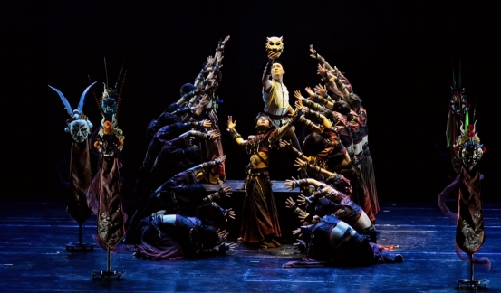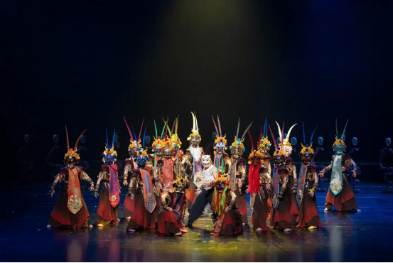 男子群舞《千面》以国家级非物质文化遗产恩施傩戏为核心创作素材,深度扎根土家族傩面文化这一民族文化瑰宝。作品以“绘面—戴面—卸面”的完整行为逻辑为艺术叙事主线,生动系统地演绎了土家傩文化跨越千年、薪火相传的厚重历史。创作过程中,我院师生立足恩施本土,精准提炼傩戏经典戏剧角色形象,萃取“摆手、踏地、抬脚”等极具土家族地域特色的原生舞蹈动作元素,打造专属地域舞蹈符号;并以当代青年手艺人的视角,将非遗传承作为核心精神内核,以现代舞蹈语汇演绎传统傩舞神韵,深情刻画了土家男子坚毅昂扬的民族风骨,展现了新时代土家族青年紧跟时代步伐、守护民族瑰宝、砥砺前行的精神风貌,有力讴歌了民族文化绵延赓续、国泰民安的美好时代图景。