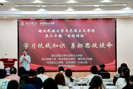 4 月 28 日, 由湖北民族大学“自信领航石榴籽” 辅导员工作室、马克思主义学院和马克思主义学院“自信领航”行动小组联合举办的第三十期 “自信讲坛” 在德智楼三楼远程教学观摩室成功举办。活动特邀全国高校“双带头人”教师党支部书记“强国行”专项行动团队湖北民族大学“双带头人”教师党支部书记“强国行”专项行动团队负责人、马克思主义学院教授蔡诗敏老师担任主讲人。“自信领航石榴籽” 辅导员工作室成员、马克思主义学院 “自信领航” 小组成员出席活动,马克思主义学院大一全体学生也积极参与其中。