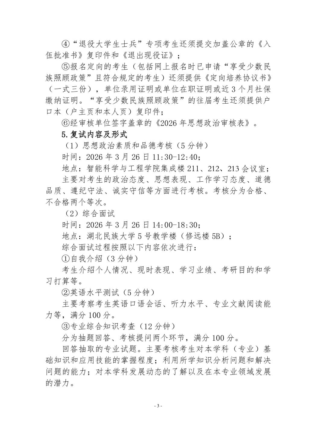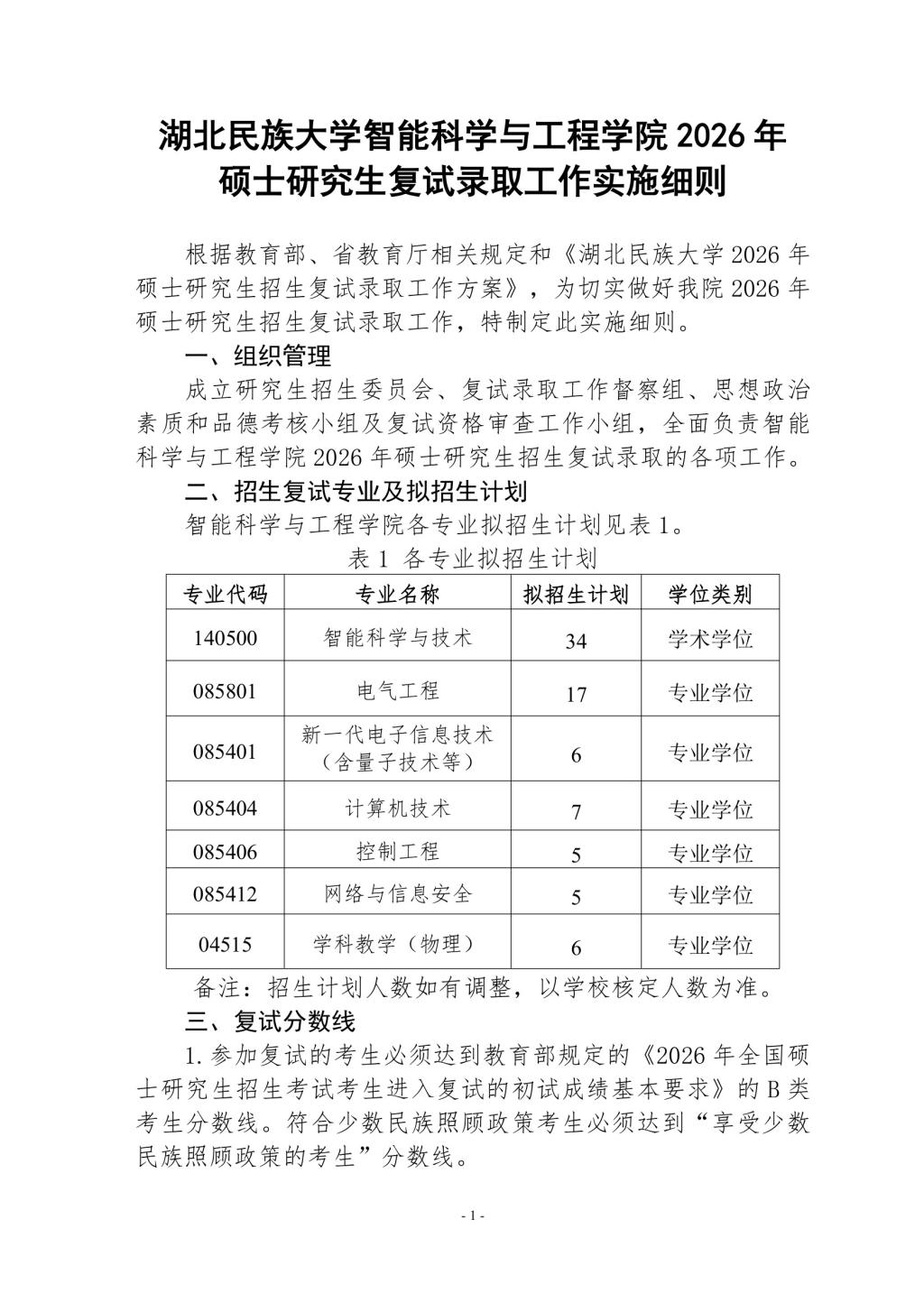 湖北民族大学智能科学与工程学院2026年硕士研究生复试录取工作实施细则