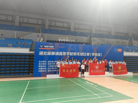 2023年5月26日-28日,湖北省普通高等学校学生组羽毛球比赛(学生组)在武汉大学卓尔体育馆举行。我校由张辉、周一系两名教师担任教练员带领16名运动员参赛,经过努力拼搏,我校荣获男子丙B组(体育院校组)团体亚军;张然获男子丙B组男子单打第四;谭朕、张胜勇获丙B组男子双打第四;陈泓宇获男子丙B组男子单打第七名的好成绩。