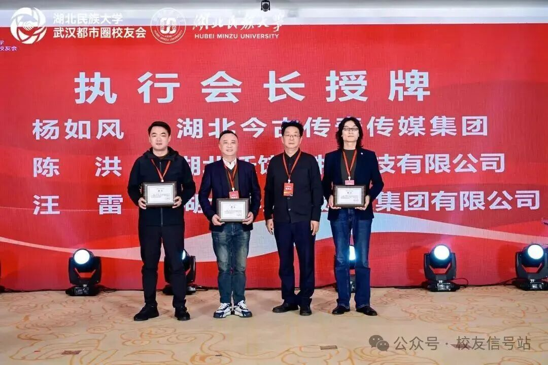 湖北民族大学党委委员、党委组织部常务副部长洪雁为新当选的执行会长杨如风、陈洪、汪雷授牌。