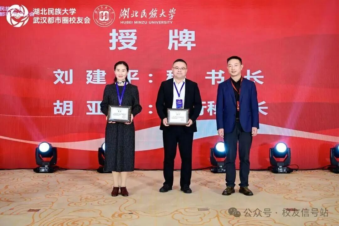 湖北民族大学招生就业与校友联络处处长严森为新当选的秘书长刘建平、执行秘书长胡亚琼授牌。