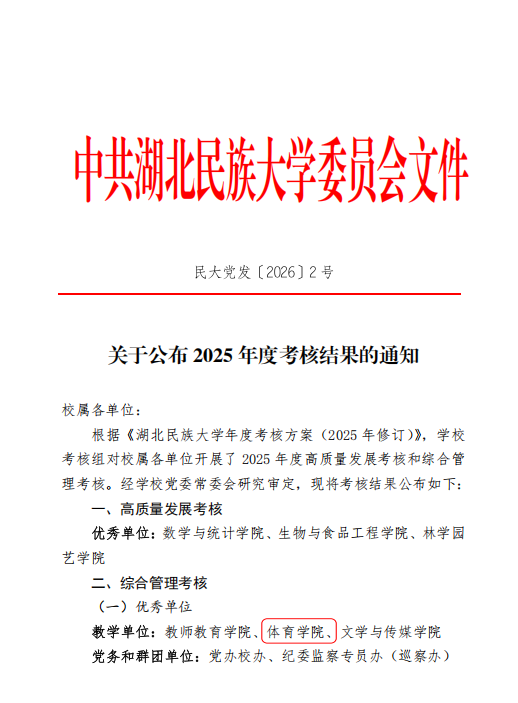 喜报:湖北民族大学体育学院获评2025年度综合管理考核优秀单位