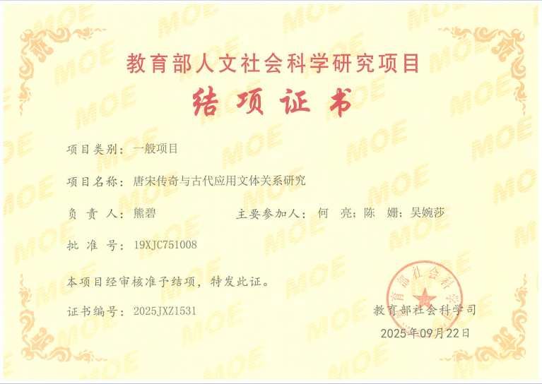 由我院熊碧博士主持的教育部人文社科项目《唐宋传奇与古代应用文体关系研究》(编号:19XJC751008)日前顺利结项。
