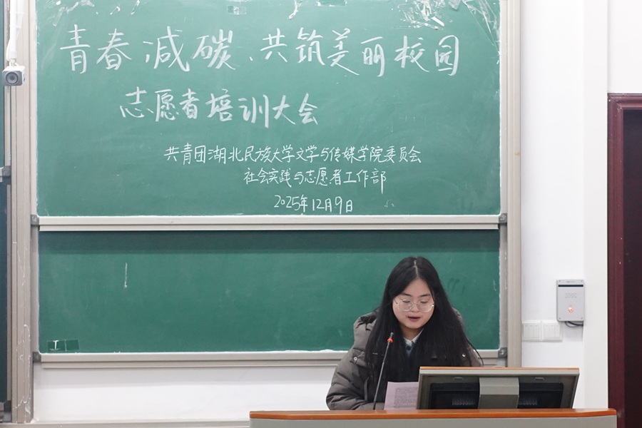 本网讯(记者 冷丽 李蓉华 莫秋萍(见习)/文 徐荣(见习) 李悠然(见习)/图)12月9日,共青团湖北民族大学文学与传媒学院委员会社会实践与志愿者工作部于修远楼5A101教室举行以“青春减碳·共筑美丽校园”为主题的志愿者培训大会。青年志愿者协会成员及硒望之光团队成员参加本次培训大会。