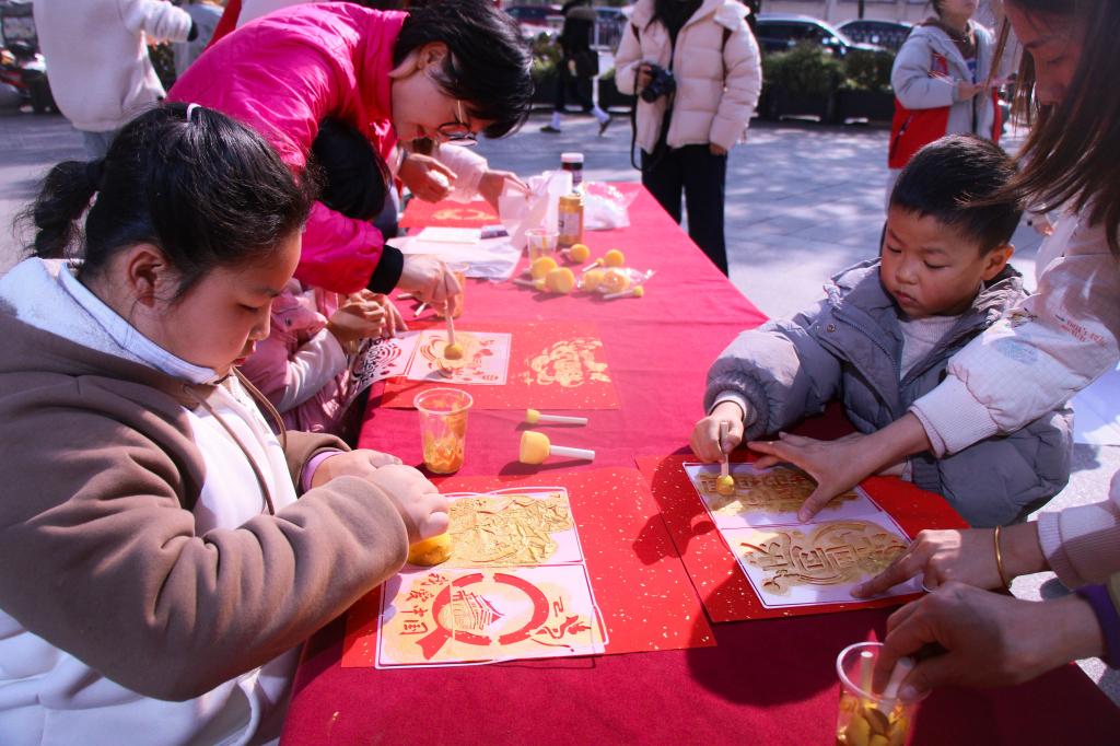 拓印体验区里,志愿者详细讲解拓印技艺的历史渊源与操作流程,手把手示范调墨、覆纸、按压等操作步骤。孩子们发挥想象力,将民族传统纹样复刻在宣纸上,一张张充满童真与创意的拓印作品相继诞生,在动手实践中领略非遗文化的独特魅力,增强文化自信与民族自豪感。