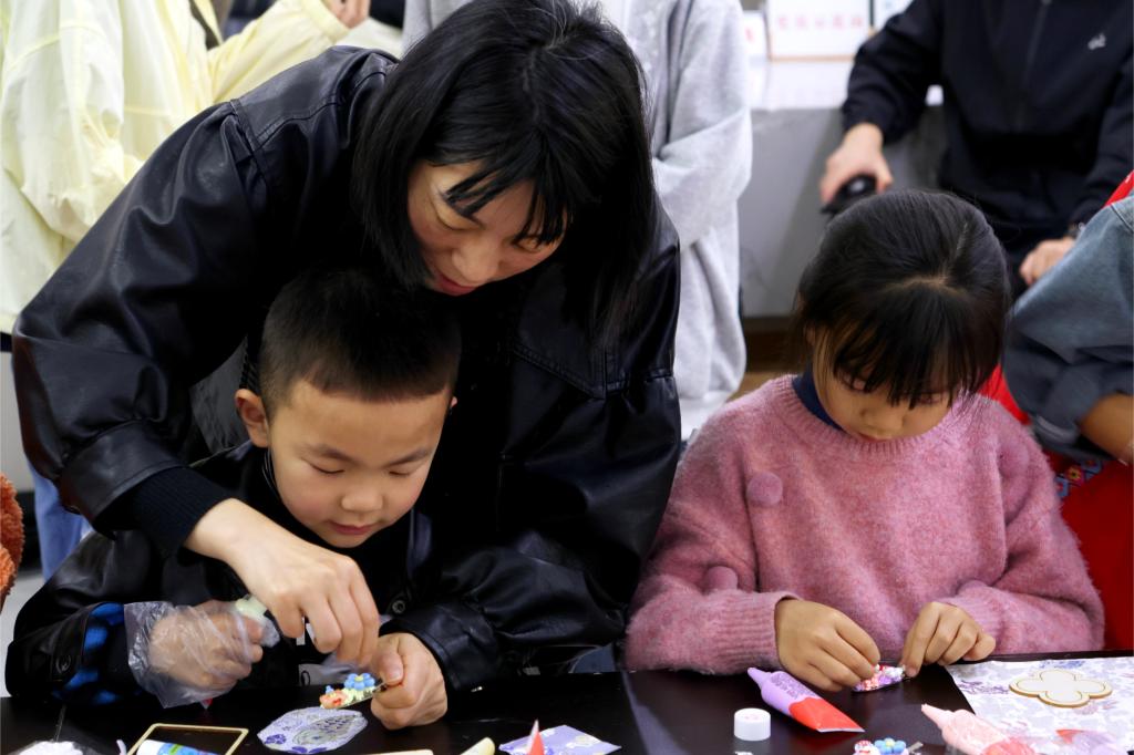 活动现场布置温馨有序,设有宋锦冰箱贴、奶油胶发卡、石膏娃娃上色三大体验环节。