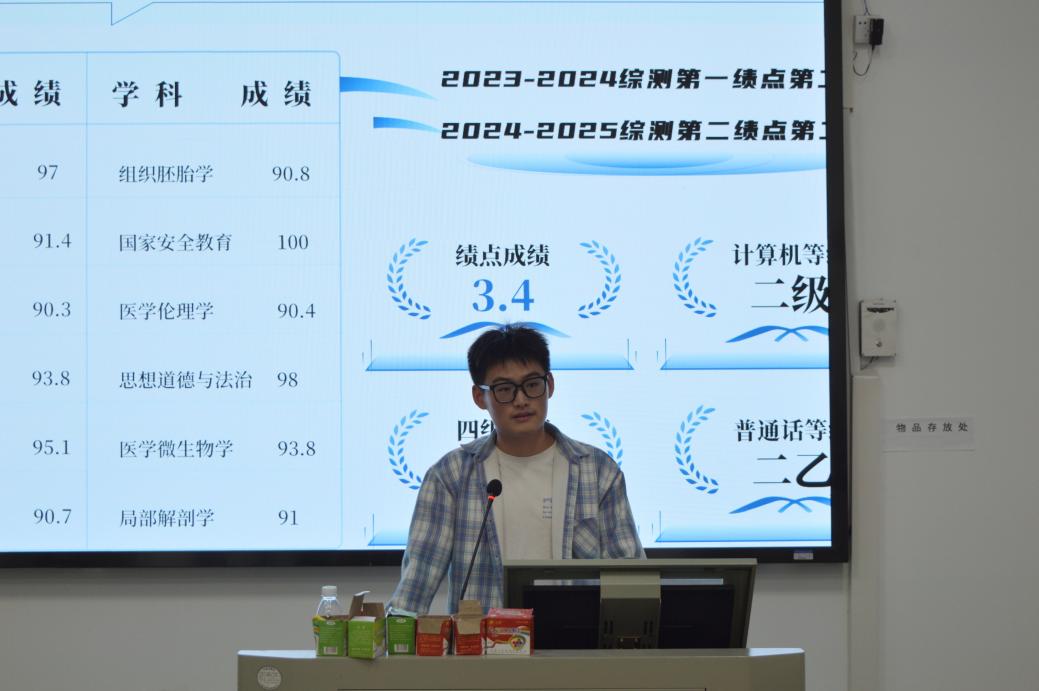 陈乙华结合医学生课程密、无“重点”的特点,建议提前规划期末复习,分享英语四级备考教训,推荐题库备战计算机二级。他强调优先学科与双创竞赛,选择导师攻克结项难,分享疫情核酸检测、支教经历,以“知不足而奋进,望远山而前行”寄语。