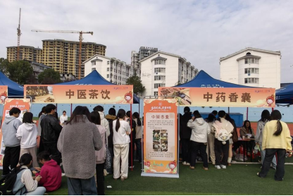 活动现场,医学部展区亮点纷呈。三款特色茶饮备受关注:板党五宝茶由党参、黄芪、红枣、当归、枸杞配伍,工作人员详解药材功效与炮制要点;暖阳和胃茶以陈皮、干姜、炙甘草调制,适配日常调理且可反复冲泡;湖北特有姜汁可乐茶饮,尽显地域特色。中药香囊区人气高涨,远志、薄荷、藿香、紫苏等十几种药草整齐陈列,可搭配成安神、驱邪驱虫、解郁等多种功效香囊,师生既可选择工作人员专业配置,也能亲手DIY,沉浸式感受非遗手工艺魅力。此外,简易把脉体验活动直观传递中医“治未病”智慧,国潮文化展示丰富了体验维度。